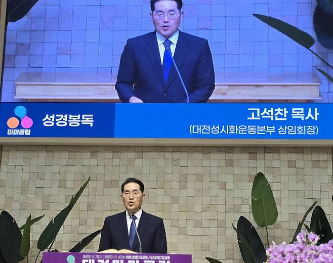 대전마마클럽의 영상 소개 후 대전성시화운동본부 상임회장인 고석찬 대전중앙장로교회 목사가 시편 145편 1편을 성경봉독했다.