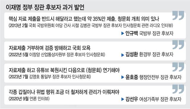 장관 후보자들이 과거 야당일 때 청문회에서 자료제출 문제로 비판 목소리를 낸 적도 여러 차례 있어 '이중잣대·내로남불' 지적까지 나온다.