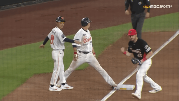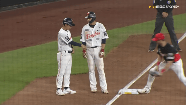 유로결은 볼넷 덕에 자동으로 3루에 진루했을 뿐 엄연히 인플레이 상황이었기 때문에 3루에 발을 붙이고 있어야 했다. 그런데 3루를 밟자마자 안심한 듯 발을 떼고 김재걸 코치의 지시를 들으러 갔다. 어처구니없는 '본헤드 플레이'였다.