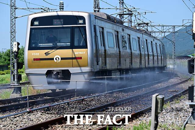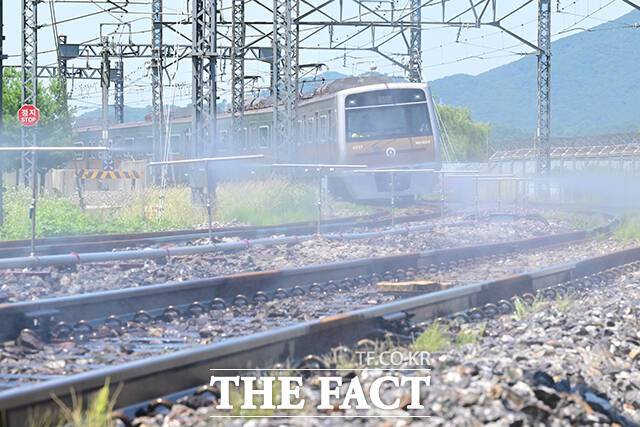 [더팩트ㅣ남윤호 기자] 11일 오전 서울 강서구 9호선 개화 차량기지에서 철도 온도가 48도를 넘으면 자동살수 되는 '레일살수 장치'가 가동되고 있다.