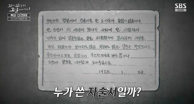 이 자술서를 쓴 주인공은, 오휘웅이야. 그가 다시 범행을 인정한거야. 당연히 무슨 일이 있었겠지? 형사들이 조사실로 몰려와 자신을 어디론가 끌고 갔고, 모진 고문을 한 후에 진술 내용을 불러 주길래, 어쩔 수 없이 자술서를 썼다는 거야. 경찰 조사에 이은 검찰에서의 자백. 여전히 실질적인 살인의 증거는 없었지만, 범행을 인정하는 오휘웅의 이 자필 자술서는 결정적이었어.