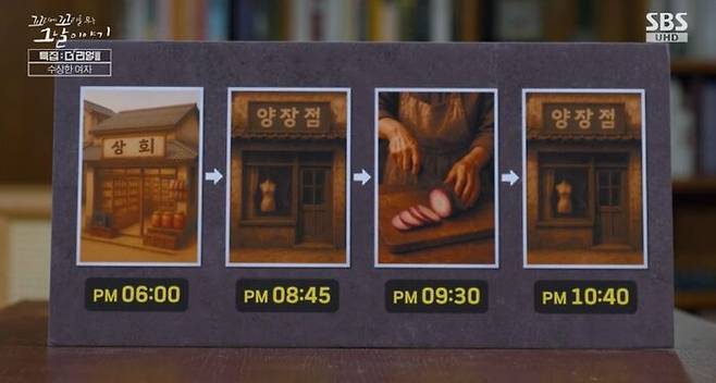 종합해 보면 정숙 씨의 사건 당일 행적은 이래. 저녁 6시쯤 평소답지 않게 소주를 사서 집으로 갔고, 8시 45분쯤 손에 피를 묻힌 채 양장점에 와서 남편이 사기당한 하소연을 하고, 9시 30분쯤 시댁에 가서 떨리는 손으로 무를 썰다가, 가게에 간다는 시어머니 말에 황급히 집으로 온 거지. 그게 10시 40분쯤. 아마도 그때 양장점에 가서 문고리가 열려있다는 걸 알린 걸로 보여.