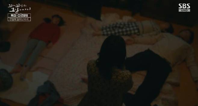 양장점 아주머니는 얼른 가보자며 정숙 씨를 앞세워 쌀가게로 갔어. 정숙 씨가 조심스레 문고리가 풀린 가게 문을 열고 들어서는데, 저기 안쪽 방문도 열려 있는 게 보여. 불 꺼진 방안에 들어선 정숙 씨는, 전등불을 켜자마자 그대로 주저앉고 말았어. 쌀 가게 방 안에서 정숙 씨의 남편과 어린 두 아이가 모두 숨져있던 거야.