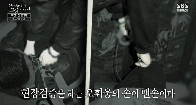사진에서 뭐가 눈에 띄어? 아까 판사가 법정에서 오휘웅에게 장갑에 대해 질문했지? 그런데 현장을 재연하는 오휘웅의 손에 장갑이라곤 없어.