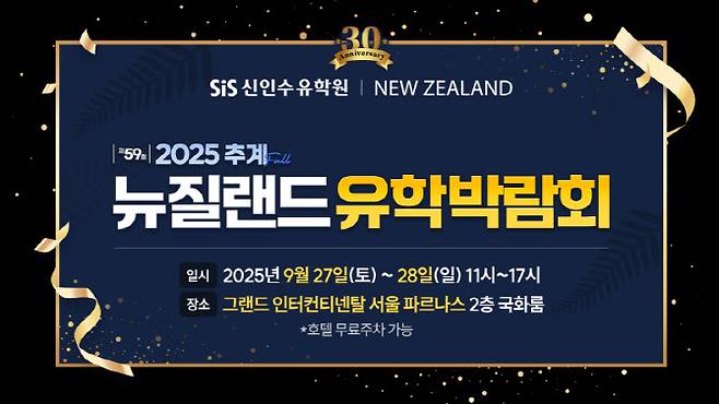SiS 신인수 유학원이 주최하는 제59회 뉴질랜드 유학·이민박람회가 오는 9월 27일부터 28일까지 서울 강남구 삼성동 그랜드 인터컨티넨탈 호텔 서울 파르나스에서 개최된다.