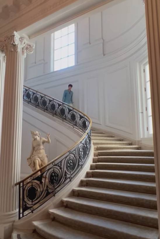 고풍스러운 대리석 계단과 조각상이 어우러진 실내에서 여유롭게 계단을 내려오며, 마치 궁전 속 왕자 같은 모습을 연출했다.
