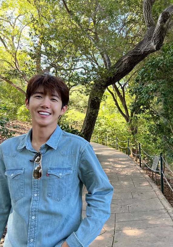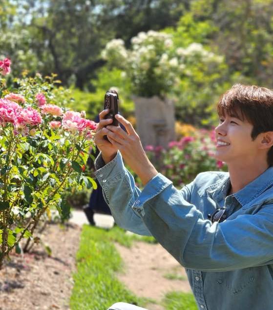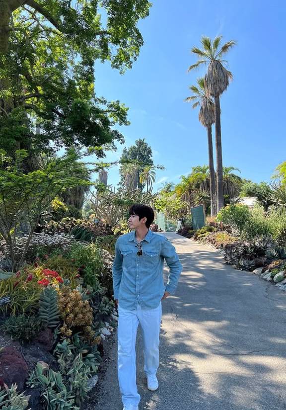 사진 속 황광희는 LA의 대표적인 명소로, 아름다운 정원과 다양한 예술작품, 역사적 자료들로 유명한 헌팅턴 도서관, 미술관과 식물원(The Huntington Library, Art Museum, and Botanical Gardens)에서 여유로운 시간을 보내고 있다.