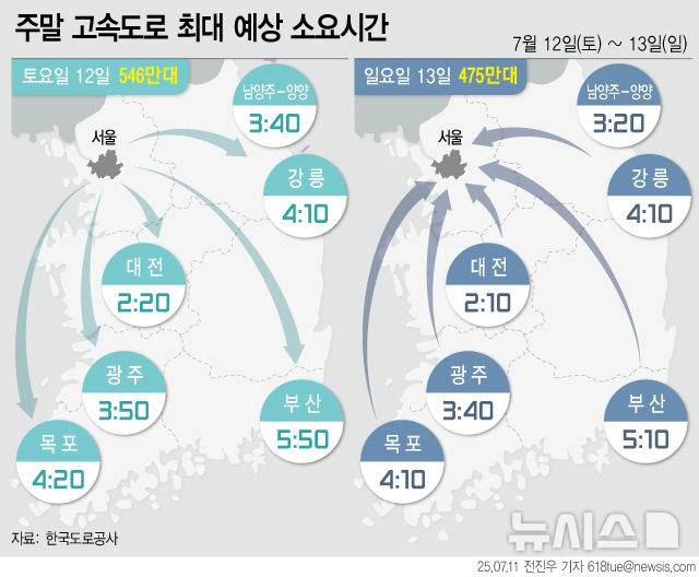 [서울=뉴시스] 11일 한국도로공사의 주말 교통량 전망에 따르면 7월 두 번째 주말은 무더운 날씨로 고속도로 교통량이 최근보다 증가할 것으로 보인다. 영동선과 서울양양선 등 주요노선과 상습정체구간으로 정체가 발생할 전망이다. 토요일인 12일 전국 교통량은 546만대로 1만대 줄고 일요일인 13일은 7만대 증가하는 것으로 나타났다. (그래픽=전진우 기자)