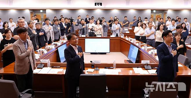 [서울=뉴시스] 추상철 기자 = 김광용 행정안전부 재난안전관리본부장 등 참석자가 11일 오후 서울 종로구 정부서울청사에서 열린 '폭염대책 관계기관·전문가 합동토론회'에서 국민의례를 하고 있다. 2025.07.11. scchoo@newsis.com