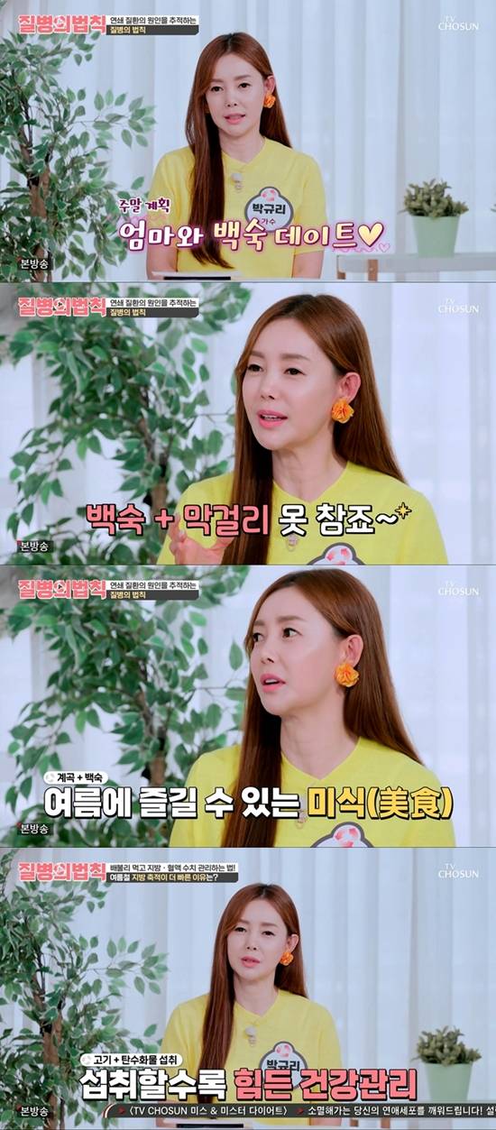박규리는 10일 방송된 '질병의 법칙'에서 "올여름이 유독 덥고 길어서 주말엔 엄마와 계곡으로 향해 발 담그고 백숙에 막걸리 한 잔 하려 한다"라며 여름철의 소소한 행복을 공유했다.