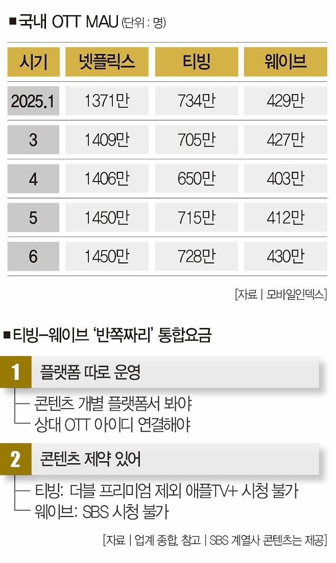이 때문에 양사의 더블 이용권은 통합요금제라기보단 제휴요금제에 가깝다. 20대 직장인 심지은씨는 "한쪽 가격의 요금을 결제하면 두 OTT를 다 쓸 수 있을 줄 알았는데 더블 이용권은 두 요금제를 할인된 가격으로 구매하는 것처럼 느껴진다"며 "원래부터 티빙과 웨이브를 동시에 이용하던 사람이 아니라면 그렇게까지 유리하진 않은 것 같다"고 말했다.