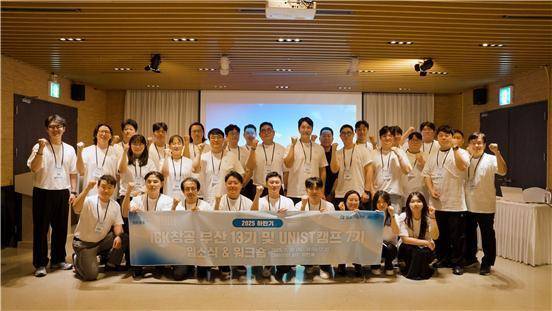 [어제(10일) 열린 2025년 상반기 IBK창공 부산 13기 및 UNIST캠프 7기 입소식에서 혁신창업기업으로 선발된 기업 관계자들이 기념 촬영을 하는 모습(사진=기업은행 제공)]