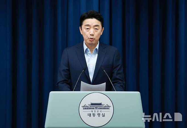 [서울=뉴시스] 최동준 기자 = 강훈식 비서실장이 11일 서울 용산 대통령실에서 문화체육관광부 장관 후보자에 최휘영 놀유니버스 대표, 국토교통부 장관 후보자에 김윤덕 더불어민주당 의원 인선 발표 브리핑을 하고 있다. (대통령실통신사진기자단) 2025.07.11. photocdj@newsis.com