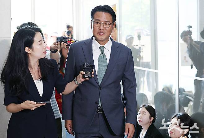 직권남용 권리행사 방해 혐의를 받는 김태효 국가안보실 1차장이 11일 오후 서울 서초구 순직해병 특검 사무실에 피의자 신분으로 조사를 받기 위해 출석하고 있다.