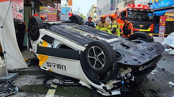 이 사고로 택시에 타고 있던 60대 기사 A 씨가 등을 다쳐 소방 당국에 의해 병원으로 이송됐습니다.