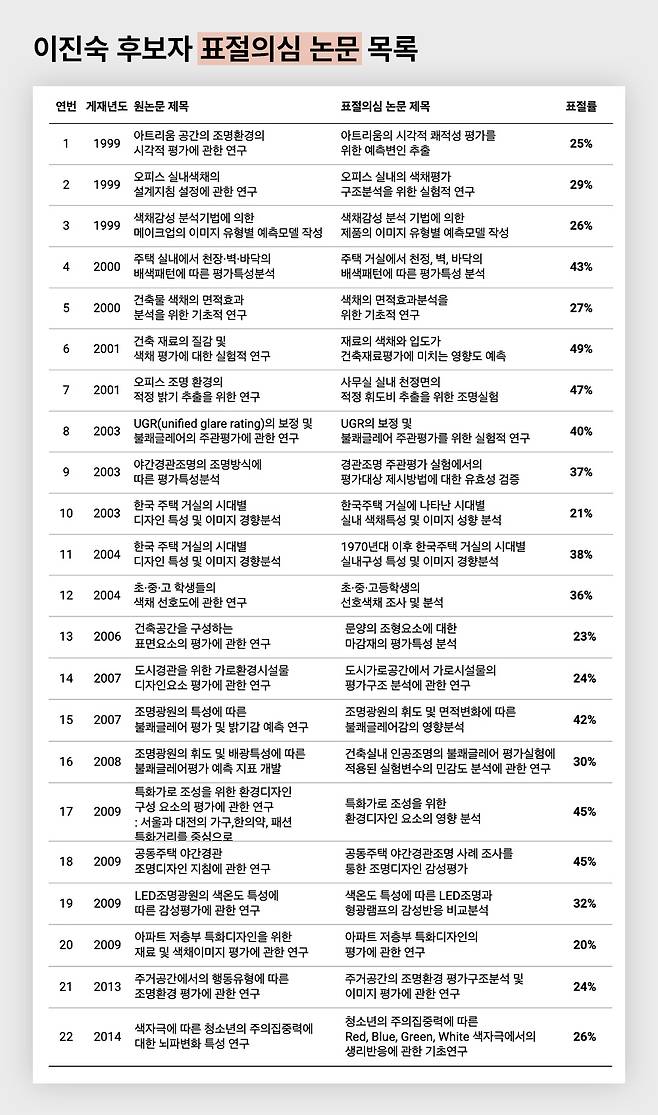 이 후보는 자신이 지도한 제자들의 석·박사 학위논문을 베껴 쓴 뒤 이를 학술지에 투고하면서 단 한 건도 출처와 인용 표기를 하지 않은 것으로 드러났다. 이 후보의 논문이 실린 대한건축학회 등은 이 같은 행위를 표절, 즉 연구 윤리 위반으로 규정하고 있다.