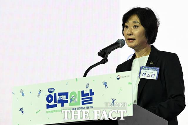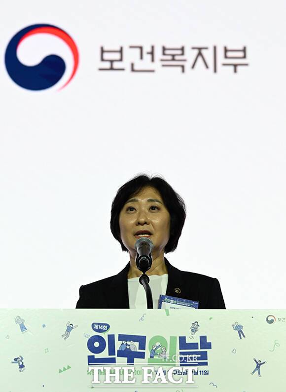 이스란 보건복지부 제1차관이 11일 오후 서울 서초구 JW메리어트호텔에서 열린 제14회 인구의 날 기념행사에 참석해 기념사를 하고 있다.