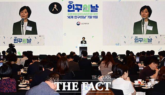[더팩트ㅣ임영무 기자] 이스란 보건복지부 제1차관이 11일 오후 서울 서초구 JW메리어트호텔에서 열린 제14회 인구의 날 기념행사에 참석해 기념사를 하고 있다.