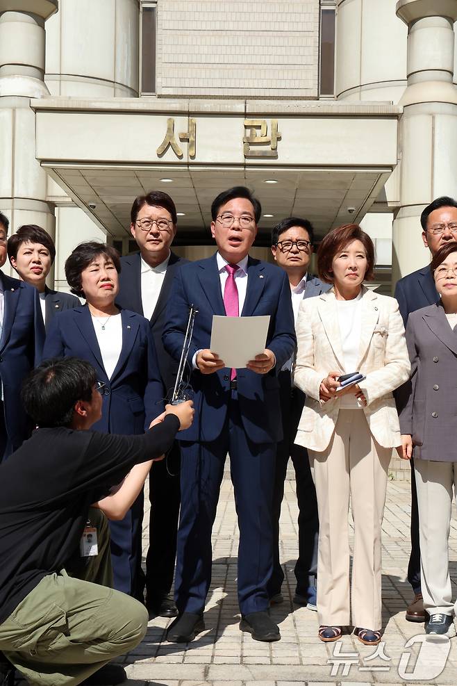 (서울=뉴스1) 황기선 기자 = 송언석 국민의힘 비상대책위원장 겸 원내대표와 의원들이 11일 오후 서울 서초구 서울중앙지방법원에서 특별검사팀의 의원실 압수수색을 규탄하고 있다