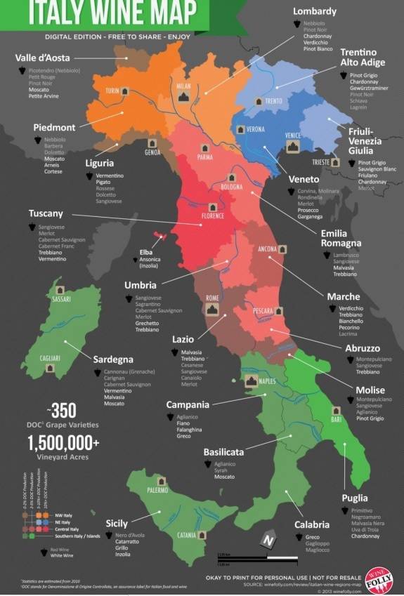 샴페인 뺨치는 전통방식 스파클링 와인 프란치아코르타(롬바르디아 브레시아). 가볍게 즐기는 샤르마 방식 스파클링 와인 프로세코(베네토 트레비소·프리울리-베네치아 줄리아). 산지오베제 품종의 최고봉 키안티 클라시코(토스카나 피렌체와 시에나)와 브루넬로 디 몬탈치노(시에나). 로미오와 줄리엣이 사랑한 아마로네와 소아베(베네토 베로나), ‘와인의 왕’ 바롤로와 ‘와인의 여왕’ 바르바레스코(피에몬테), ‘남부의 바롤로’ 타우라시(캄파냐). 에트나 화산재를 먹고 자라는 네렐로 마스칼레제와 스위트 와인 마르살라(시칠리아). ‘남부의 보물’ 프리미티보와 네그로아마로(풀리아).
