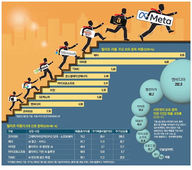 스스로 '데이터 집착증'을 인정한 라퐁이 중시하는 또 다른 지표는 직원 1인당 매출이다. 현재 보유 비중 1위인 메타의 경우 올해 253만달러(약 35억원)로 추정된다. 이는 올해 예상 매출을 작년 말 직원 수로 나눈 값이다. 2021년에는 164만달러였으니 4년 만에 54.5% 증가한 수치다. 또한 2024년 메타의 매출총이익률은 무려 81.7%다. 전 세계 빅테크 중에서 AI를 가장 잘 활용하고 있다는 평가를 받고 있다. 그래서 라퐁의 보유 비중 1위 종목이 메타다. AI를 통해 맞춤형 광고 시장을 키워가는 동시에 AI로 대체가 가능한 직원들은 과감하게 줄여나가고 있다.