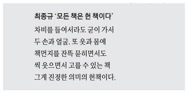 "헌책은 비싼 찻삯을 치르고 품과 시간을 들이면서도 책 한 권을 찾으러 먼 나들이를 떠날 수 있도록 이끄는 책이다. 두 손과 얼굴, 옷과 몸에 책때와 책먼지를 잔뜩 묻히면서도 씩 웃으면서 고를 수 있는 책, 어느 곳을 가더라도 다 다른 모습으로 만나는 책이 헌책이다."