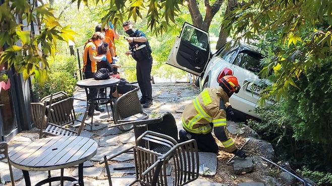 이 사고로 차량이 카페 야외 탁자에 박히며 60대 여성 운전자 A 씨가 다쳐 병원으로 옮겨졌습니다.