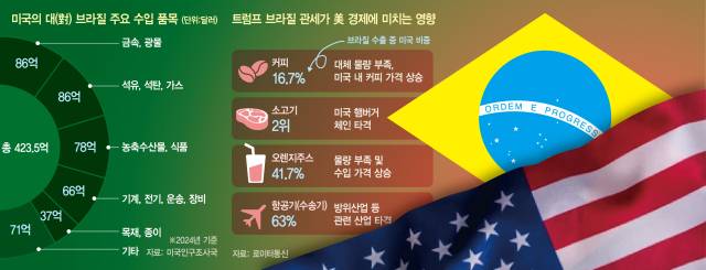 10일(현지 시간) 로이터통신에 따르면 브라질은 세계 최대 커피 생산국으로 미국에서 소비하는 커피의 3분의 1이 브라질산이다. 미국은 지난해 브라질로부터 60㎏ 기준 원두 814만 포의 커피를 수입했는데, 이는 전체 소비량의 33%에 해당한다. 커피 업계는 50% 관세가 실제 적용되면 미국 내 브라질산 커피 수입이 사실상 중단될 것으로 보고 있다. 아라비카 커피 선물 가격은 관세 발표 소식이 나온 9일 1.3%나 치솟았다. 미국 소비자브랜드협회의 톰 마드레키 부사장은 “여러 국가에 동시에 관세를 부과하면 수입 비용만 오르는 게 아니라 가격 하한선도 올라간다”며 “브라질보다 저렴한 커피가 있는 다른 나라도 할인된 가격으로 팔 이유가 없을 것”이라고 강조했다. 소고기 수급도 불안해지기는 마찬가지다. 미국은 장기 가뭄에 따른 사료 가격 폭등으로 축산 농가의 사육 두수가 70여 년 만에 최저 수준으로 떨어졌다. 이런 상황에서 최근 소고기 수입 의존이 크게 늘었고 브라질산 소고기 수입 역시 올해 1~5월 전년 동기 대비 2배 이상 늘었다. 업계에서는 50% 관세가 부과되면 기존 관세와 합쳐져 총수입세율이 76.4%까지 치솟아 브라질산 소고기 수입은 사실상 불가능해질 것이라고 보고 있다. 미국 식품 업체들이 브라질산 저지방 소고기를 들여와 햄버거용 다진 고기를 만든다는 점에서 이번 인상은 미국민들의 대표적인 외식 품목인 햄버거 가격에 타격을 입힐 것으로 전망된다. 오렌지 주스 공급 부족도 확실시되고 있다. 브라질은 세계 최대 오렌지 주스 생산국으로 미국에서 소비되는 오렌지 주스의 절반 이상이 브라질산이다. 브라질 감귤 업계 단체 시트러스BR에 따르면 2024~2025년 수확 시즌 브라질의 오렌지 주스 수출 물량의 41.7%가 미국으로 향했다. 미국은 최근 병충해와 허리케인·한파 등으로 오렌지 생산량이 88년 만에 최저치를 기록할 것으로 예상되면서 수입 의존도는 더욱 높아지고 있다. 미국의 관세 발표 소식에 오렌지 주스 선물 가격은 전날 6% 급등했다.