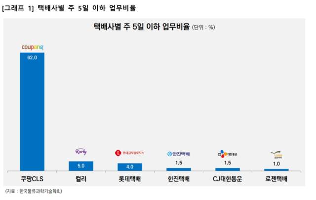조사에 따르면 주 5일 이하 배송을 한다는 택배기사 응답 비율은 CLS가 62%로 가장 높았다.