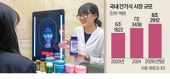 유통업계가 건기식에 주목하는 배경으로는 건강에 대한 관심 확대가 꼽힌다. 글로벌 시장조사업체 유로모니터에 따르면 국내 건기식 시장은 2020년 6조1822억원에서 지난해 7조3438억원으로 커졌다. 2028년에는 8조2912억원으로 성장할 전망이다. 유통업계 관계자는 “저속노화 등 건강에 대한 관심이 급격히 높아지며 약국 외에서도 건기식을 찾는 소비자가 늘고 있다”며 “건기식은 마진도 높은 편이라 수익성과 성장성을 동시에 잡을 수 있는 카테고리로 성장할 것”이라고 말했다.