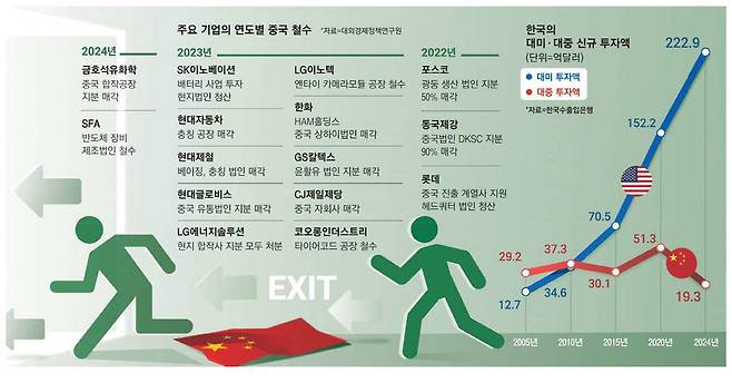 11일 대외경제정책연구원에 따르면 2017년 이후 지난해까지 중국 사업을 정리하거나 축소한 우리나라 대·중견기업은 40여 곳에 이른다. 특히 일부 유통업체에 국한됐던 탈중국 움직임은 최근 들어 자동차와 철강, 석유화학 등 주요 제조기업으로 확대되고 있다.