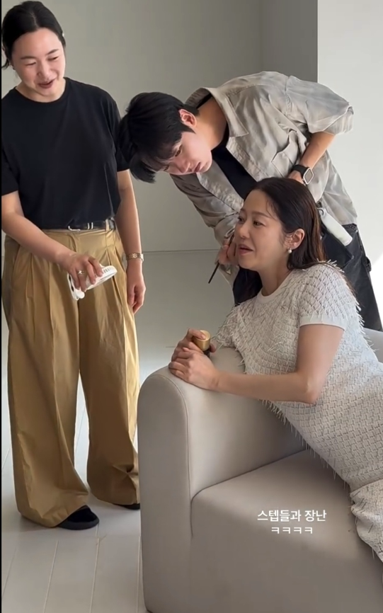 사진 속 고현정은 흰색 조직감 니트 원피스를 입고 소파에 기대 메이크업을 받고 있다. 한 손엔 턱을 괴고, 다른 손은 조용히 무릎 위에 놓은 채 카메라를 향해 미소 짓었다. 그의 앞에는 여러 스태프들이 얼굴을 다듬고 있지만, 고현정의 표정은 이미 완성돼 있었다.