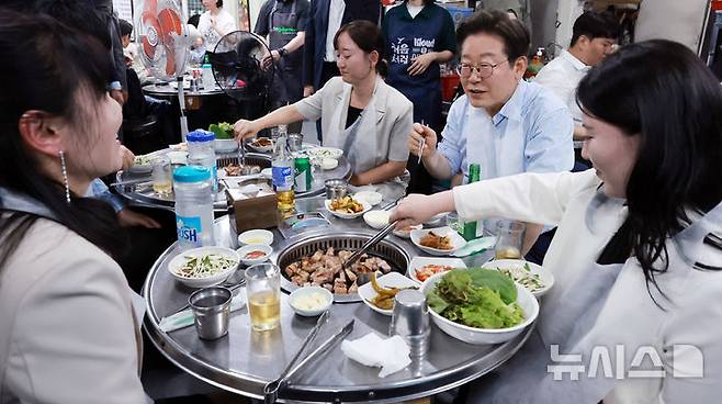 [서울=뉴시스] 최동준 기자 = 이재명 대통령이 11일 서울 종로구 한 식당에서 시민들과 '삼겹살 외식'을 하고 있다.