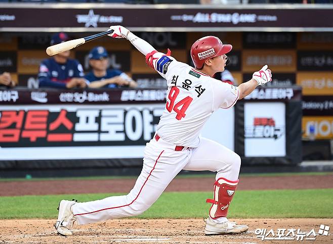 (엑스포츠뉴스 대전, 박지영 기자) 11일 오후 대전한화생명볼파크에서 열린 '2025 신한 SOL Bank KBO 퓨처스 올스타전' 남부리그와 북부리그의 경기, 3회말 2사 만루 북부 최윤석이 2타점 적시타를 때려내고 있다.