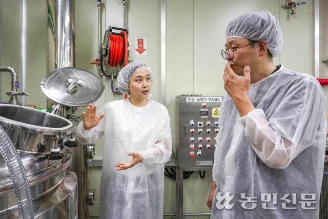9일 전남 나주에 있는 전남도농업기술원 청년창농타운 제품지원센터에서 창농타운 신규 입주기업 (주)로컬오누이의 편호준(45) 대표가 정수화(33) 주무관과 제품 개발에 관해 토론하고 있다. 창농타운 입주기업은 가공·포장 장비를 비롯해 130여 종의 첨단 장비를 보유한 제품지원센터 에서 창업 아이디어를 고부가가치 상품으로 발전시키기 위한 연구·개발 지원을 받을 수 있다.