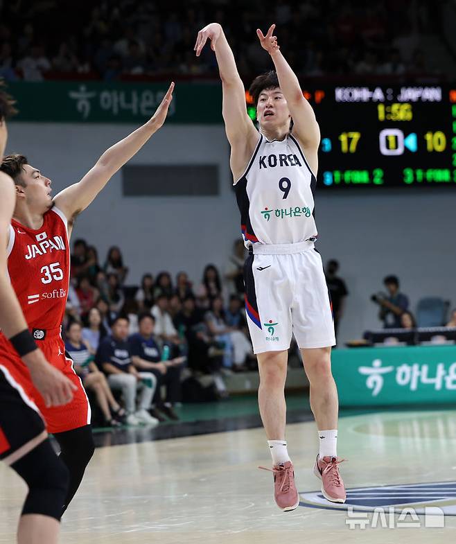 [안양=뉴시스] 조성우 기자 = 11일 오후 안양 동안구 정관장 아레나에서 열린 2025 남자농구 국가대표 평가전 대한민국과 일본의 경기, 한국 이승현이 3점슛을 성공시키고 있다. 2025.07.11. xconfind@newsis.com