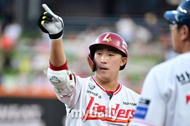북부 3루 코치 이병규의 아들인 이승민(SSG)이 4회말 선두타자로 나와 안타를 친 후 기뻐하고 있다.
