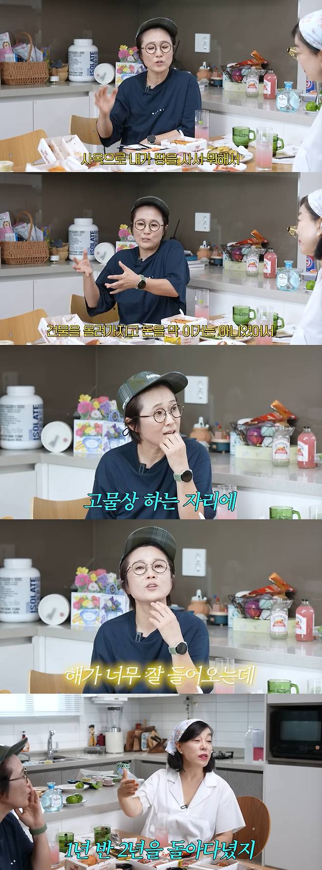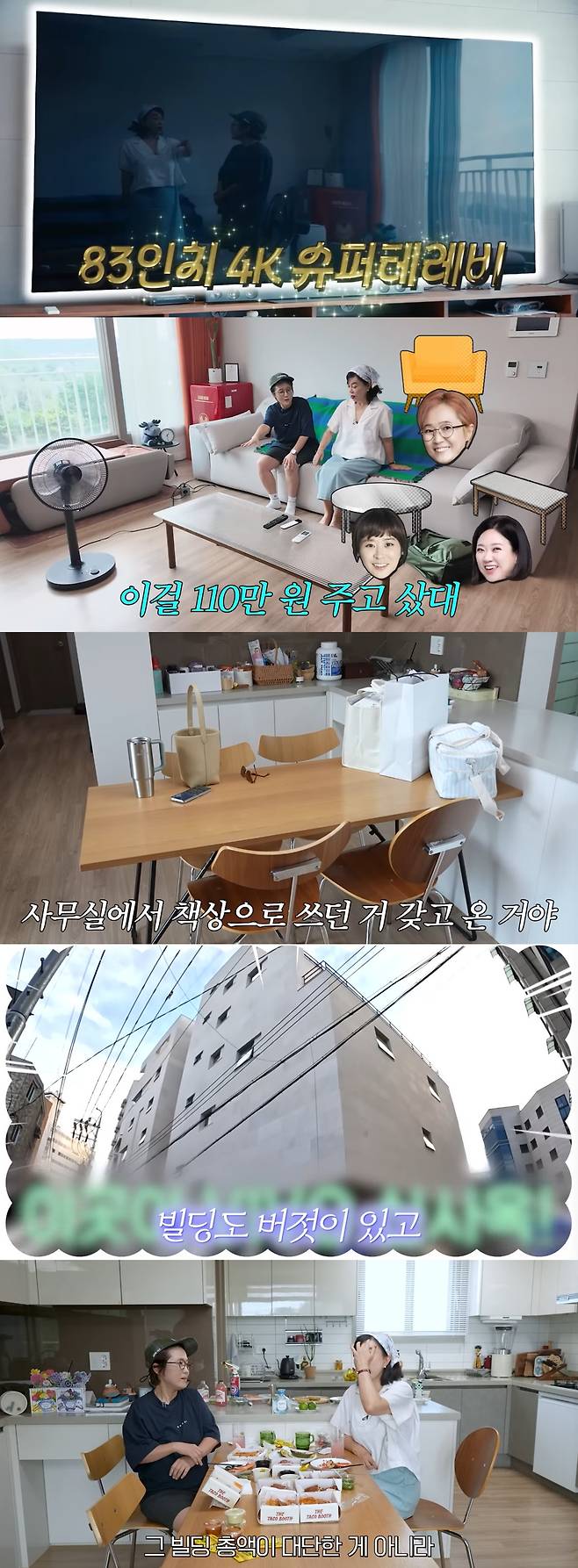 송은이는 "난 가구를 친구와 돌려쓴다. 최강희, 김숙과. 내가 테이블 가져오고 내 소파를 가져가고. 돌려쓰면 분위기가 바뀌니 (새 가구를) 안 사는 거다"라고 이야기했다. 이어 그는 사무실에서 책상과 냉장고를 가지고 왔음을 밝혔다.