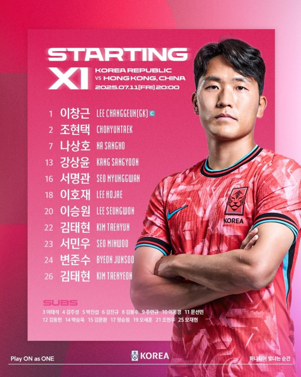 이날 한국은 이호재(포항스틸러스), 나상호(마치다젤비아), 이승원(김천상무), 서민우(강원FC), 강상윤, 김태현(이상 전북현대), 조현택, 서명관(이상 울산HD), 김태현(가시마 앤틀러스), 변준수(광주FC), 이창근(대전하나시티즌)을 스타팅으로 내세운다.