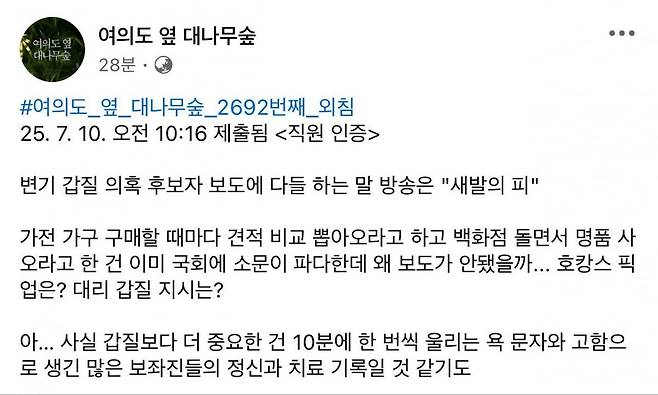 이날 '여의도 옆 대나무 숲'에 글을 쓴 작성자는 "변기 갑질 의혹 후보자 보도에 다들 하는 말, 방송은 '새발의 피"라는 글이 올라왔다. 강 후보자의 이름을 직접 언급하지는 않았으나 정황상 강 후보자를 겨냥한 내용이라는 게 정치권 시각이다.