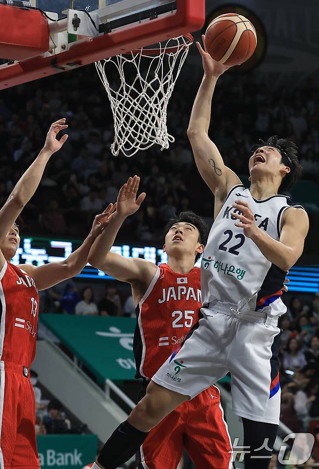 (안양=뉴스1) 박정호 기자 = 11일 오후 경기도 안양 정관장 체육관에서 열린 하나은행 초청 2025 남자농구 국가대표 평가전 대한민국과 일본의 경기에서 여준석이 리바운드를 잡아내고 있다. 2025.7.11/뉴스1