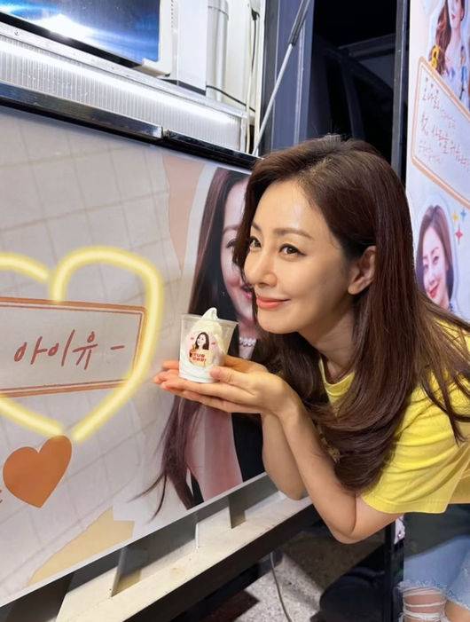공개된 사진 속에서 오나라는 아이유가 보낸 아이스크림 차 앞에서 행복해하며 다양한 사진을 남겼다. 오나라는 '아이유' 글씨에 하트를 보내며 마음을 드러냈다.
