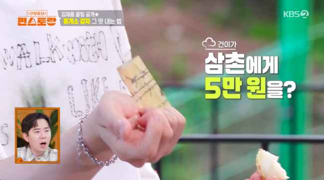 조카는 “이거 값이에요”라며 고마움에 5만원 용돈을 건넸고, 이를 본 김재중 어머니는 “지 용돈으로 준 거다”라고 덧붙였다. 감동받은 김재중은 “조카한테 팁을 받았다”라며 “고마워”라며 포옹했다.