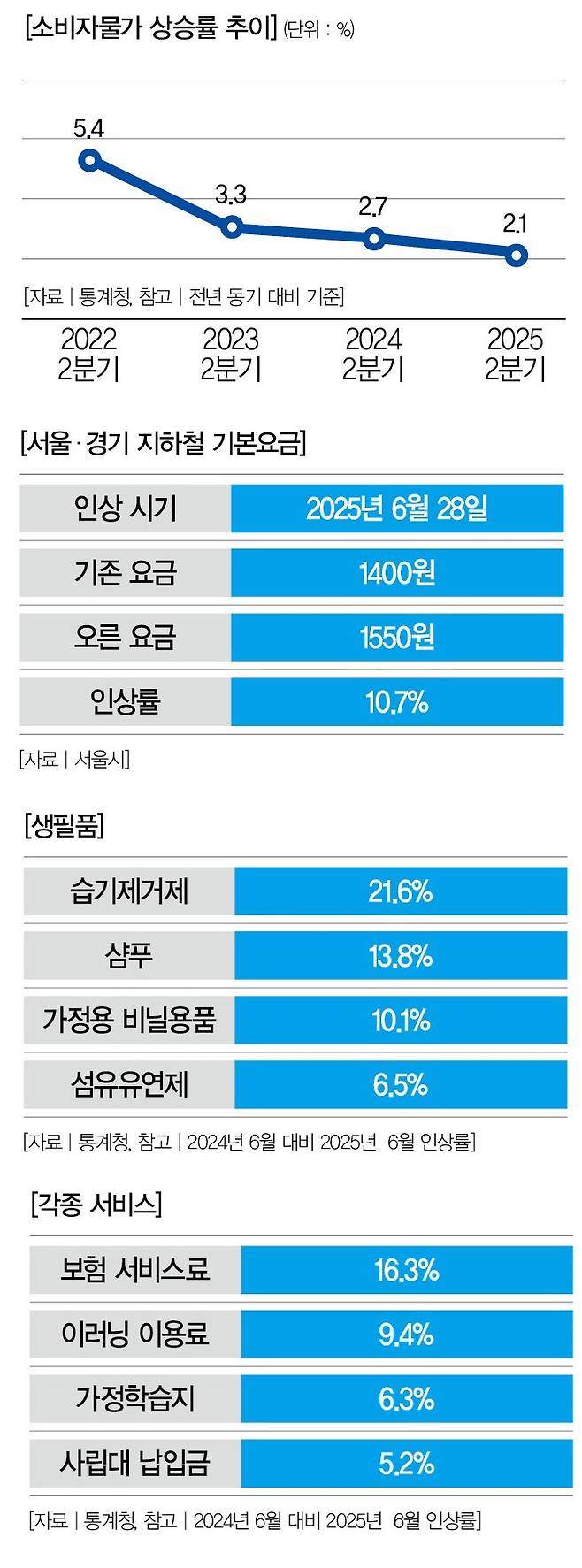 하지만 그것만으론 고물가를 잠재우기 어렵다는 목소리도 적지 않다. 오른 게 가공식품만이 아니라서다. 앞서 언급했던 지하철 요금이 대표적이다. 지난 6월 28일을 기점으로 수도권 지하철 기본요금이 기존 1400원에서 1550원으로 10.7% 올랐다. 2023년 10월 이후 1년 8개월만의 가격 인상이다.