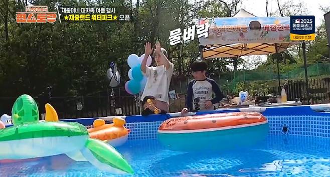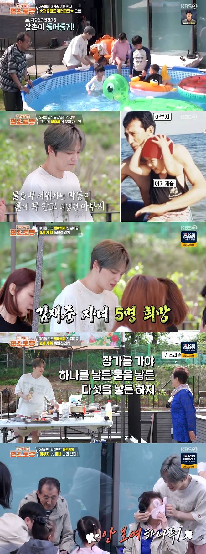 이날 김재중은 본가 마당에 대형 야외 풀장과 간식 부스를 설치해 '재중랜드 워터파크'를 오픈했다. 조카만 13명인 김재중은 매년 여름이 되면 가족들과 모여 홈워터파크를 즐긴다고. 김재중은 "조카들이 할머니, 할아버지네 물놀이를 기대하고 온다"며 "마당에 해놓으니까 애들이 너무 좋아한다"고 말했다.