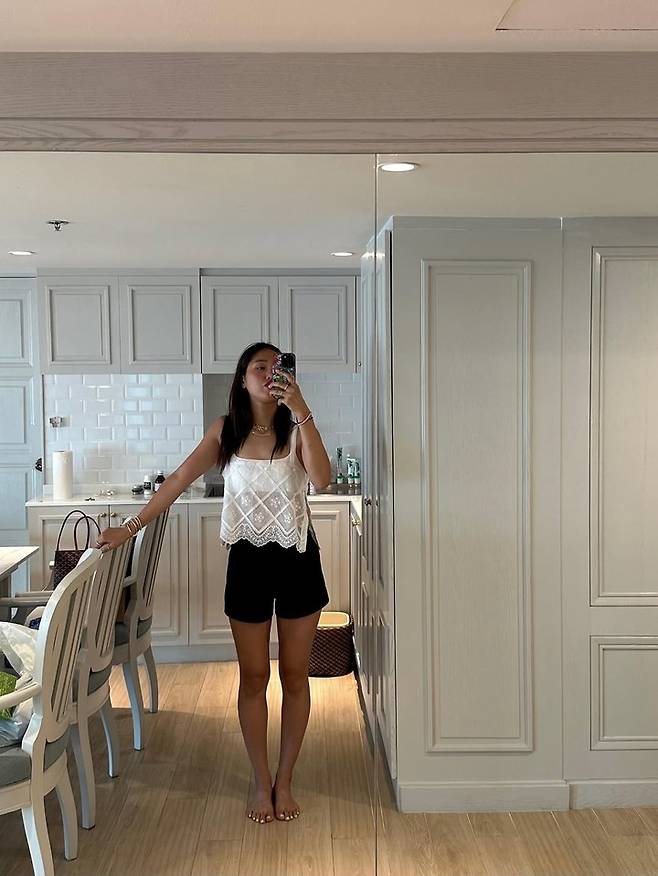 마지막 컷에서는 레이스 민소매 톱과 블랙 쇼츠를 매치해 미니멀한 데일리룩을 완성했다.