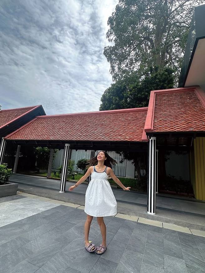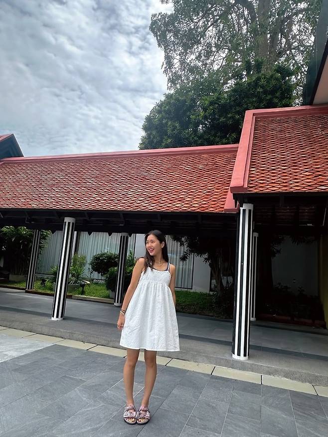 화이트 베이비돌 원피스를 입은 미미는 수영장에서 벗어나 러블리한 무드로 전환했다. A라인으로 넓게 퍼지는 드레스와 밝은 표정, 편안한 자세가 무더운 여름조차 잊게 만든다.