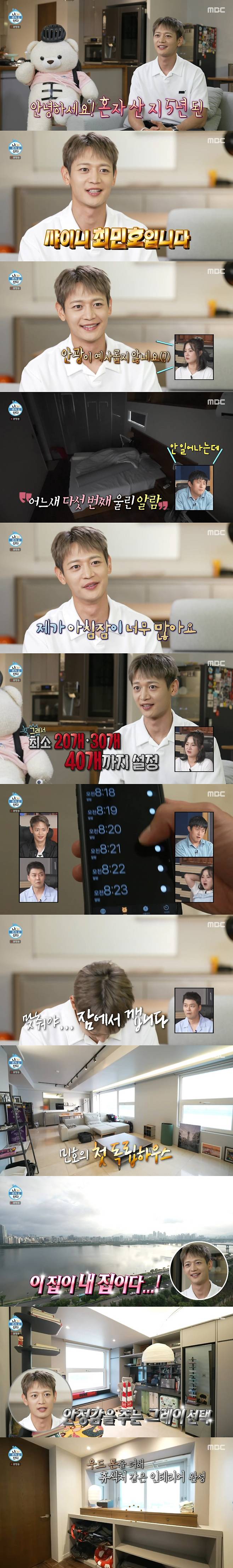 다섯 번째 울린 알람에도 깨지 않던 민호는 "아침잠이 너무 많다. 1분 간격으로 알람을 맞춰두는 이유가 알람 끄고 30초 정도가 지나면 깊은 수면으로 들어가는 순간"이라며 "최소 20개, 최대 30개, 40개까지 설정해 놓는다. 맞춰야 잠에서 깬다"고 놀라움을 안겼다.