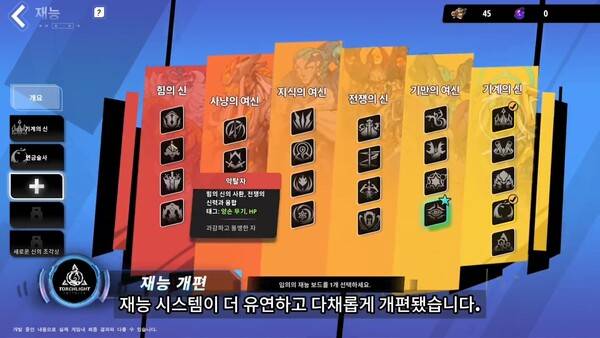 재능 시스템이 유연하게 개편된다. 기존 여섯 신의 재능 체계는 유지되지만 각 신마다 분기 재능 판이 3개에서 4개로 확대된다. 선택 방식도 기본 재능판에서 핵심 재능 2개, 3개의 분기 재능판에서 핵심 재능 1개를 고르도록 변경된다.