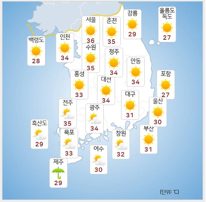 낮 최고 기온은 △서울 36도 △인천 34도 △춘천 35도 △강릉 29도 △대전 34도 △대구 31도 △전주 35도 △광주 34도 △부산 31도 △제주 29도 △울릉도 독도 27도로 예상된다.